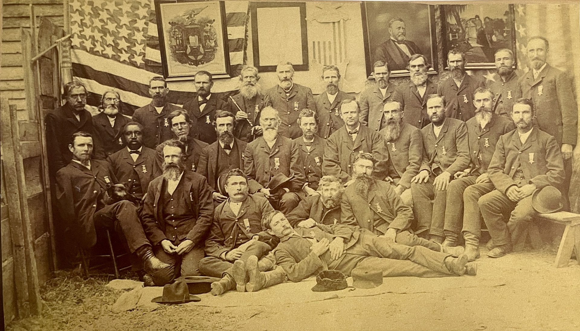 Take a few minutes and look closely at these men, sporting their Grand Army of the Republic badges and with President Grant looking over them in the background. Note the fellow in the back, showing off his flute. See the fellow at the end with the unusual eyepatch. Look at the man sitting in front of him, missing a right arm, with a dog in his lap. Beside him, you’ll see the lone USCT member in the photo.