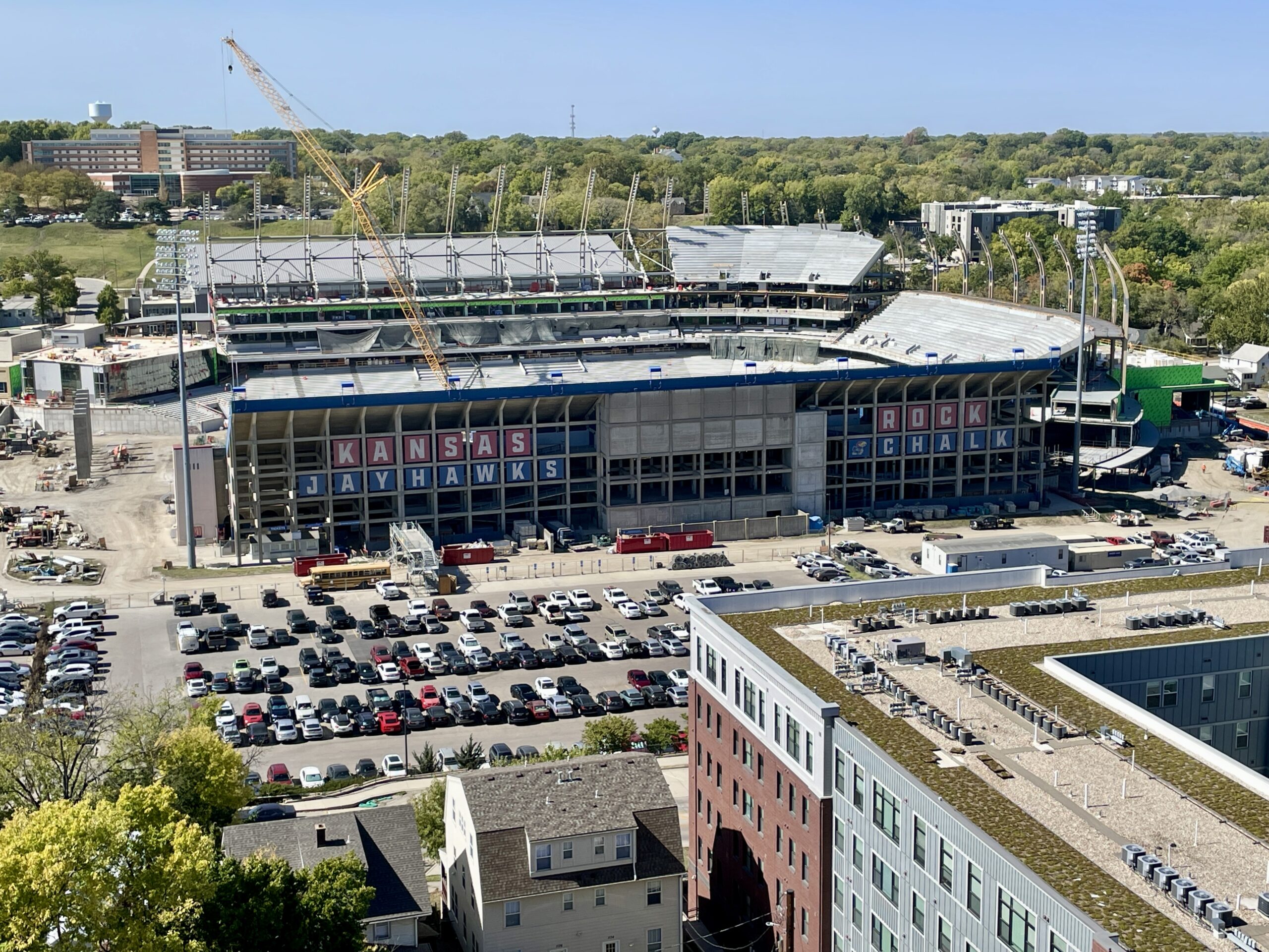 We next stopped at the Oread Hotel, which stands atop Mt. Oread, where Quantrill sent a squad to watch for Union troops. Back then, his scouts could easily see for miles across the plains from that spot. We got an even better view by heading to the hotel’s ninth floor observation deck, from which we had clear views of the surrounding countryside, as well as the nearby University of Kansas and Davis Booth Kansas Memorial Stadium, where the “Kansas Jayhawks” play.