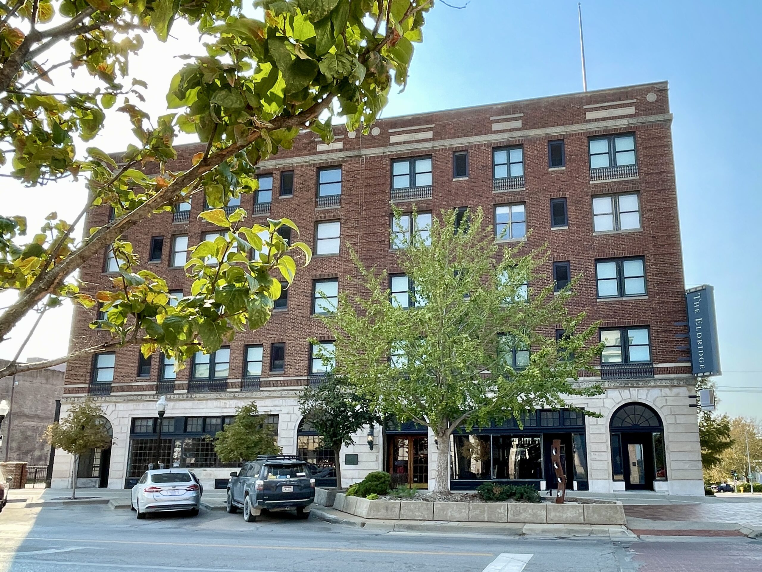 The Eldridge Hotel sits on the original site of the Free State Hotel, which was erected in 1855 by the New England Emigrant Aid Society. The society founded Lawrence in 1854 as part of its effort to bring in enough settlers to “outvote” proslavery settlers to help make Kansas a free state. They named the city after Amos A. Lawrence, a wealthy Boston merchant and philanthropist who funded the company’s settlement efforts. The original hotel was destroyed on May 21, 1856 by Sheriff Samuel Jones and his posse during the “Bleeding Kansas” border wars, but it was rebuilt by Col. Schaler W. Eldridge. The hotel was destroyed again during Quantrill’s 1863 raid, but Eldridge once again rebuilt the hotel.