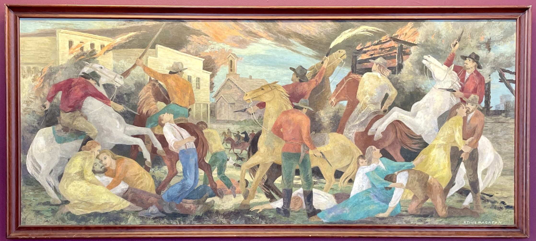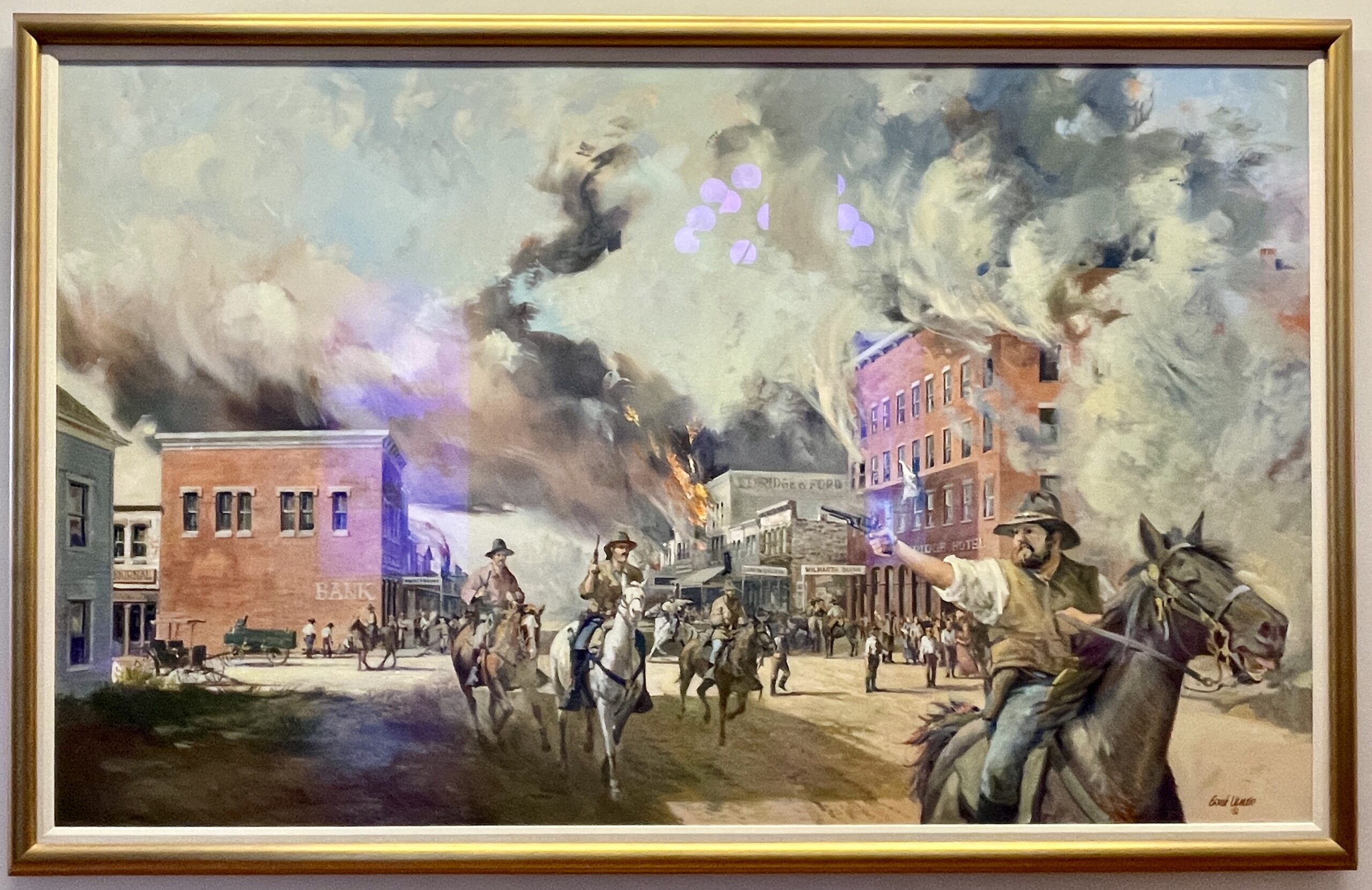 A big part of the hotel’s history is tied to the infamous raid led by William Clarke Quantrill on August 21, 1863, during which he and approximately 400 Confederate guerrillas burned down 185 houses, destroyed most of Lawrence’s downtown, terrorized its citizens, and killed between 160 to 190 unarmed men and boys. Known as the Lawrence Massacre, the violence and mercilessness of the raiders made headlines across the country. In the painting below by Ernst Ulmer, titled Blood Stained Dawn, the tall red brick building on the right is the Eldridge Hotel. A white flag of surrender can be seen hanging from one of the hotel windows.