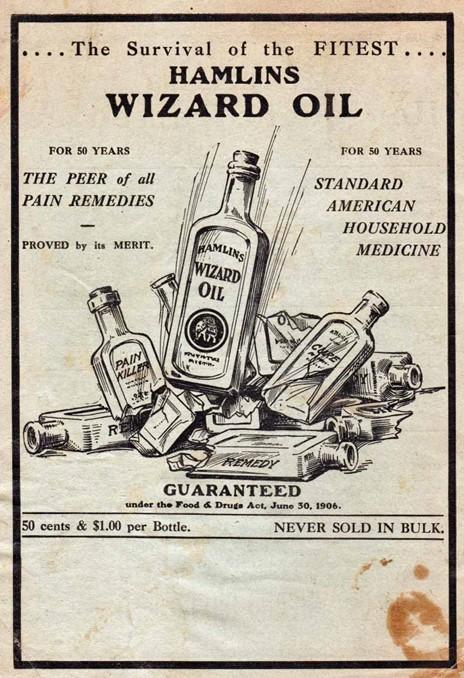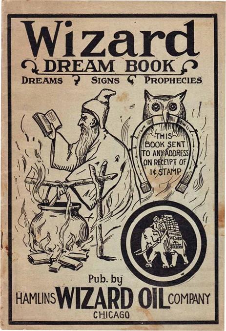 The origins of Wizard Oil are somewhat obscure. Given all the physical suffering caused by the Civil War and the return to civilian life of hordes of wounded veterans, it would be surprising if such a “patent medicine” did not become immensely popular.[11] Their proliferation to almost absurd levels is abundantly clear when perusing the pages of the new mass-produced newspapers of the late 19th century.[12] Unemployed magician John Hamlin was well-placed in Chicago to capitalize upon this craze for such nostrums, and his background in magic no doubt prepared him well for spreading the word of the miraculous properties of Hamlin’s Wizard Oil throughout the Midwest.[13] Not limiting himself to the printed word, however, he sent out traveling troupes of performers in “medicine shows” that sometimes lasted as long as six weeks in a town. These shows always combined an element of entertainment along with pitches about the wondrous cures obtainable through an application of Wizard Oil.[14] His company also published songbooks, cookbooks, and dreambooks.[15]