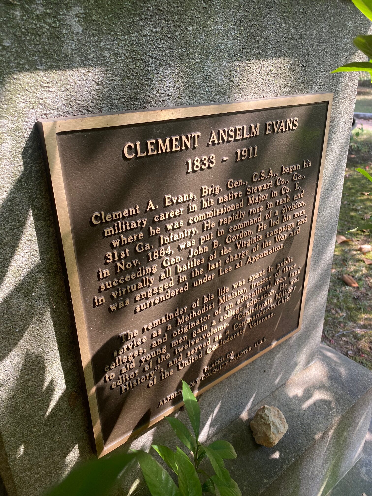 Evans survived the wound, one of five he received during the American Civil War, returned to command, and led the division from Petersburg to the surrender at Appomattox. After the war, Evans became a Methodist minister and pastored churches around Atlanta, Georgia. He also penned the Military History of Georgia and co-wrote and edited the Confederate Military History along with a four-volume Encyclopedia of Georgia. On July 2, 1911, at the age of 78 Evans passed away. His body laid in state at the Georgian capitol before being put to rest near his old commander, Gordon, in Oakland Cemetery.