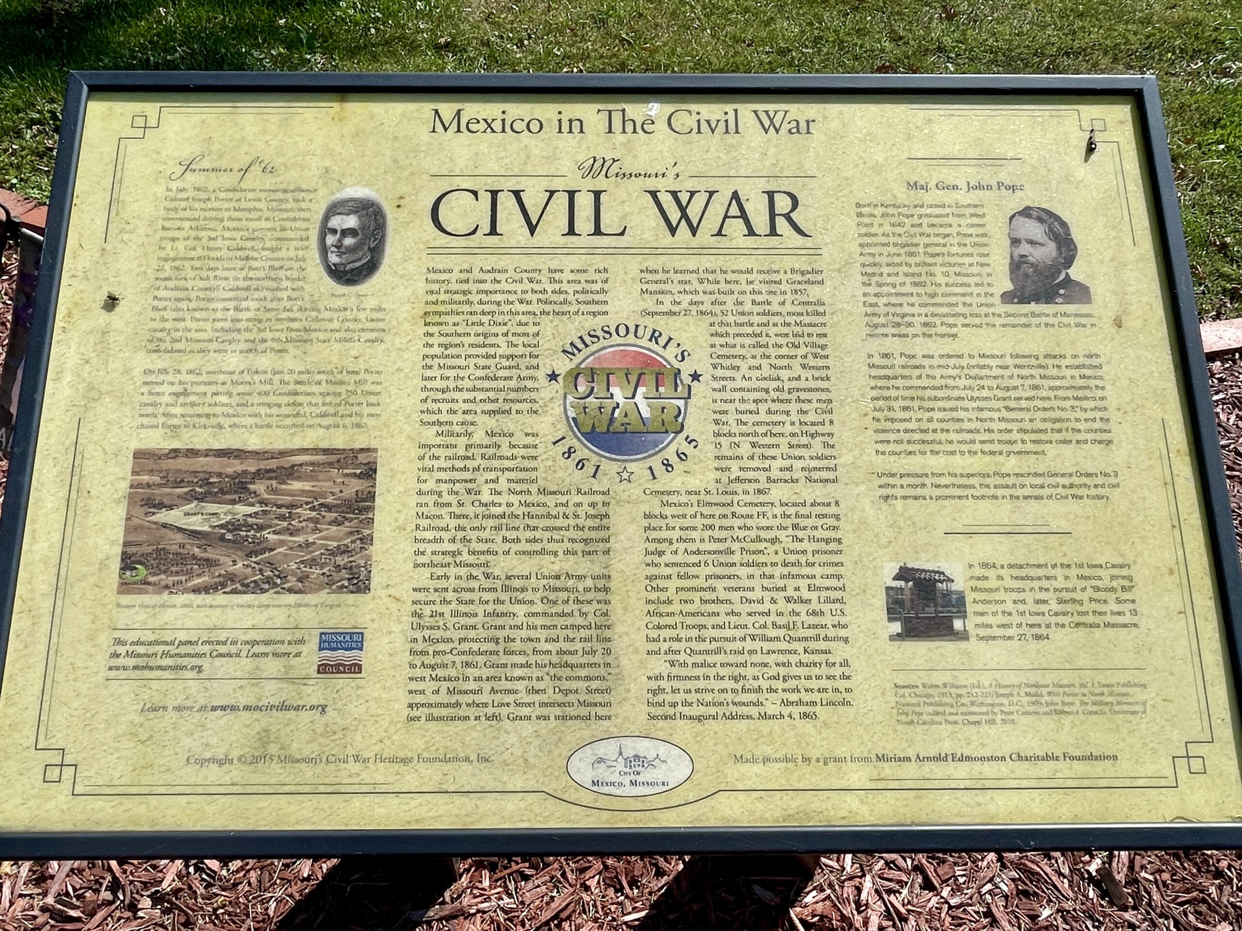 - “Mexico in the Civil War.” Missouri’s Civil War Heritage Foundation, Inc, 2015. Photo by Tonya McQuade, 4 Oct 2024.