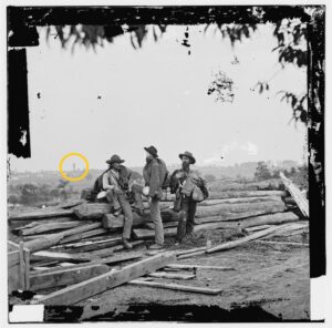 Another peculiarity of the photograph is the fact that Confederate prisoners remained on the Gettysburg battlefield eleven days after the armies departed. Frassanito addresses this question in his book, speculating that the prisoners might have been stragglers taken into Federal custody along Lee’s retreat route in the weeks after the battle. He also notes that about 2,500 captured Confederates were transferred from Gettysburg to Washington, D.C. on July 16.[3] Perhaps Brady encountered these men as they waited to begin their journey to a Northern prison camp the next day. Other historians have speculated that the three Confederates might have served as nurses at the nearby Seminary hospital or in a burial detail.