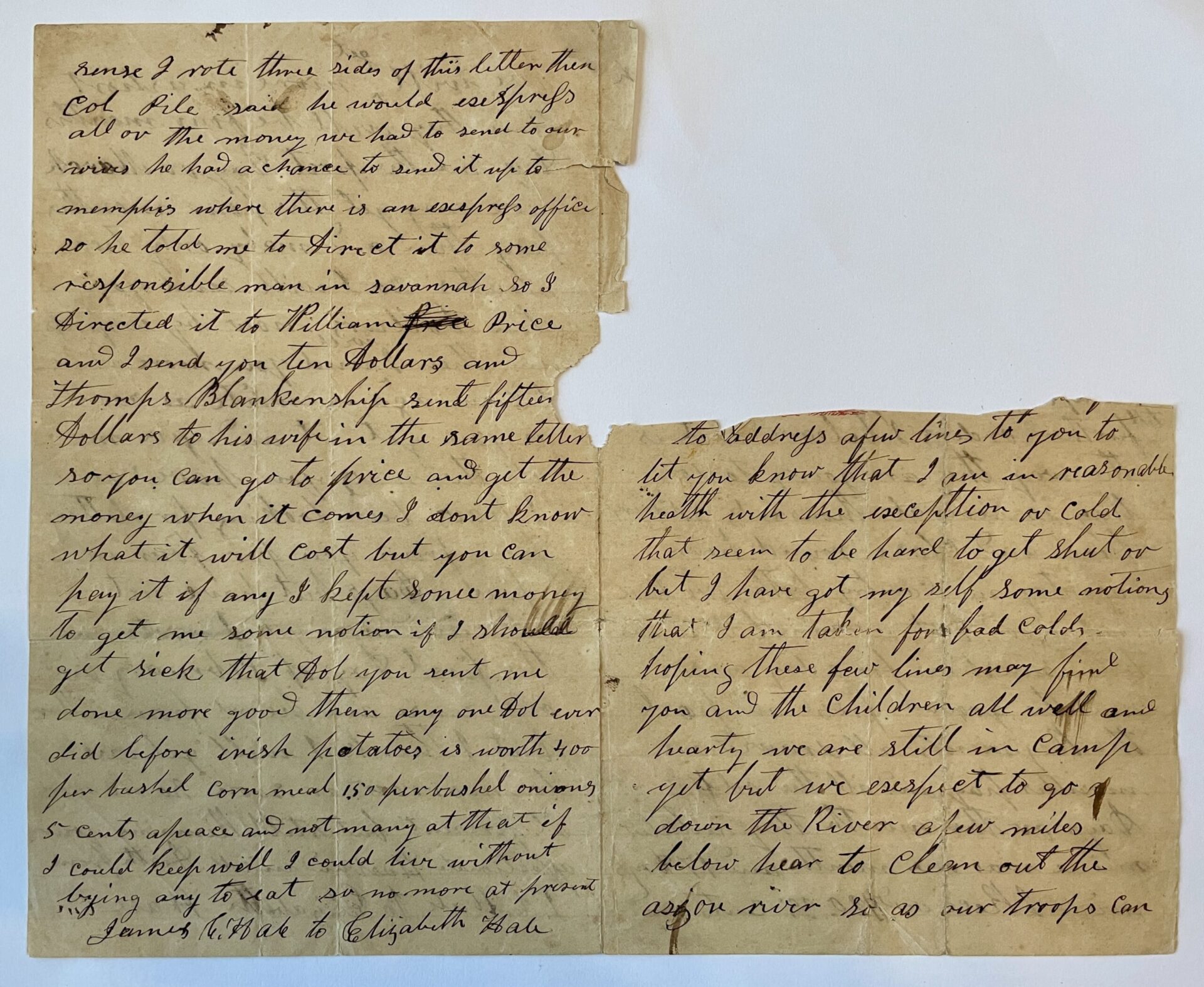 Since I wrote three sides of this letter, then Col. Pile said he would express all of the money we had to send to our wives. He had a chance to send it up to Memphis where there is an express office, so he told me to direct it to some responsible man in Savannah, so I directed it to William Price (7), and I sent you ten dollars, and Thomas Blankenship sent fifteen dollars to his wife in the same letter. So, you can go to Price and get the money when it comes. I don’t know what it will cost, but you can pay it if any. I kept some money to get me some notion [medicine] if I should get sick. That dollar you sent me done more good than any one dollar ever did before.