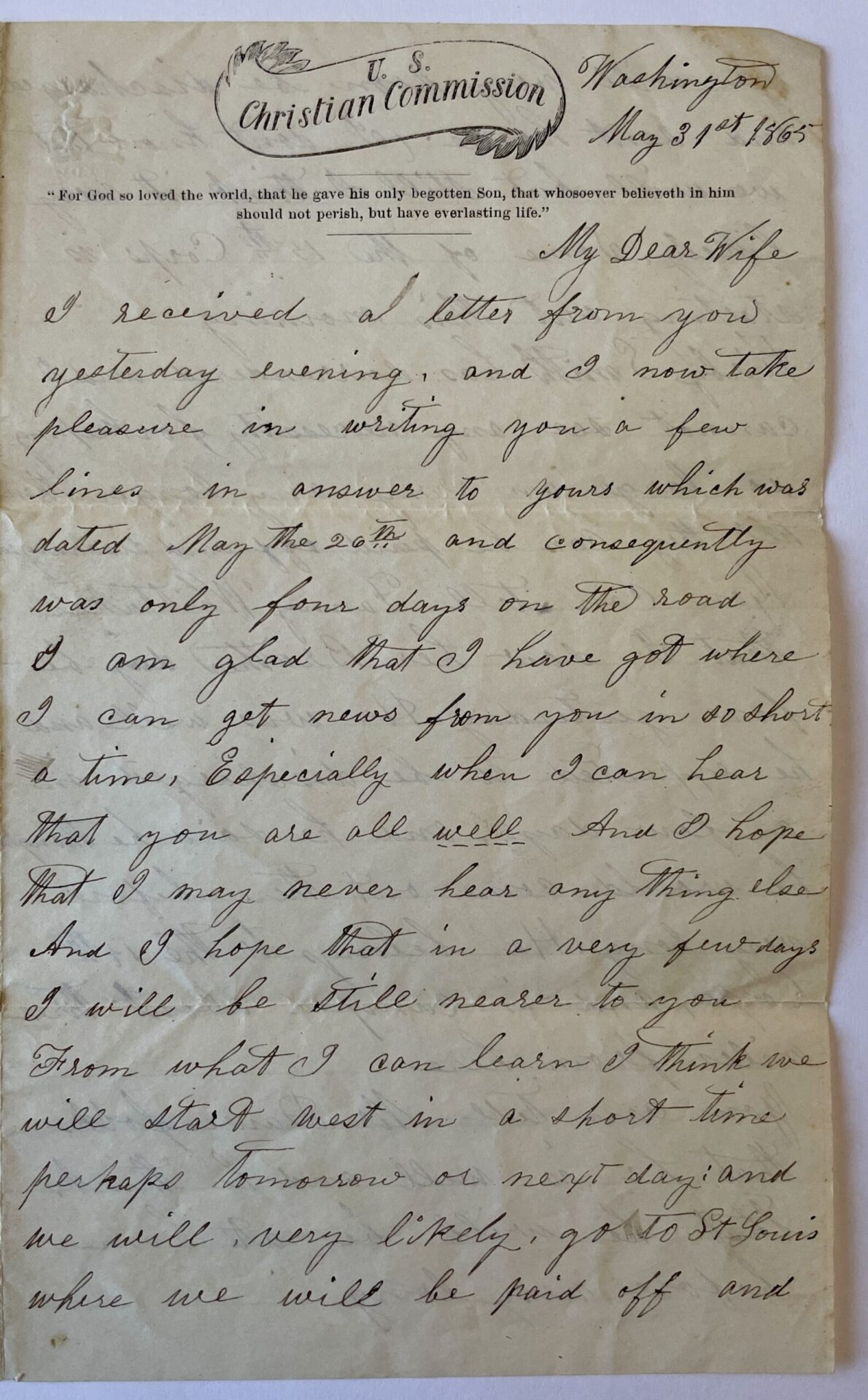 I must admit, I had a difficult time making out the word “Dol” for quite a while until I finally realized that was how Hale abbreviated “dollar.” Then, his words made sense: he was grateful to his wife for the dollar she sent because it allowed him to purchase the medicine he needed. He suffered a lot from illness while in Helena, and many soldiers died there due to the unhealthy conditions. Hale ended up being transferred to the General Hospital in St. Louis at the end of June 1863 due to his dysentery and rheumatism.