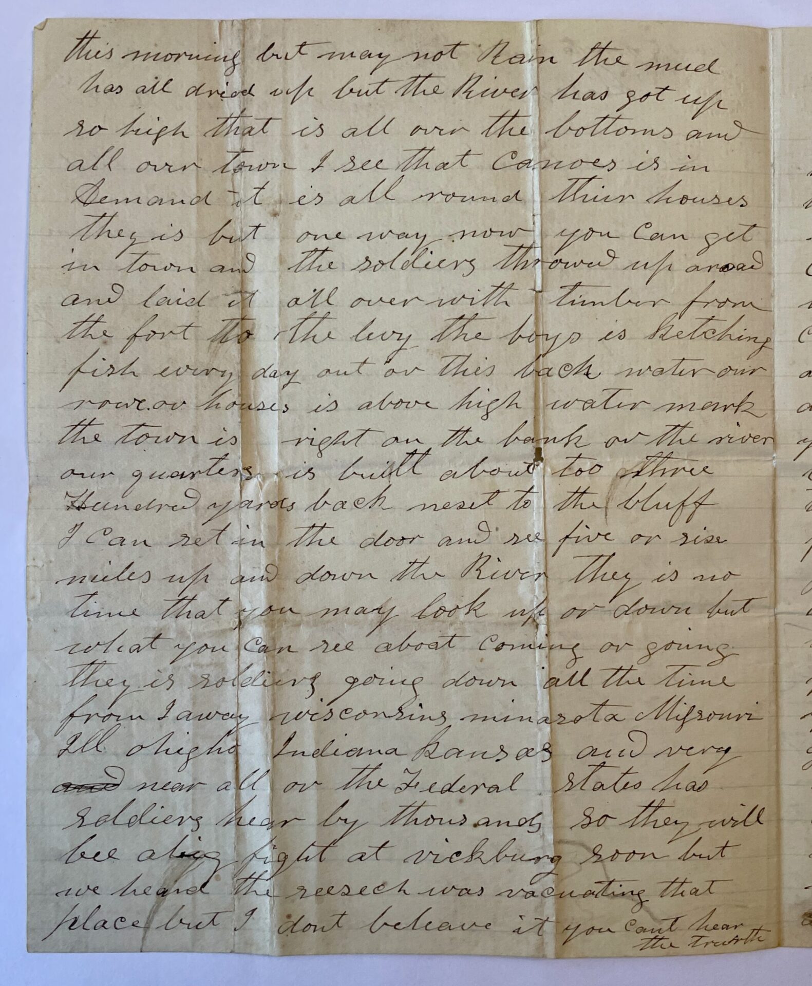 I bought myself ahigh pare of boots the other day water proof so as I could wade deep mud but has cleard off and have not rained for over aweek but it is cloudy this morning and may not rain the mud has all dried up but the River has got up so high that it is all over the bottoms and all over town I see that canoes is in demand it is all round their houses they is but one way now you can get in town and the soldiers throwed up around and laid it all over with timber from the fort to the levy the boys is ketching fish every day out ov this back water our row ov houses is above high water mark the town is right on the bank ov the river our quarters is built about too three hundred yards back next to the bluff I can set in the door and see five or six miles up and down the River they is no time that you may look up or down but what you can see aboat coming or going they is soldiers going down all the time from Iaway wisconsins minasota Mifsouri Ill ohigho Indiana kansas and very near all over the Federal States has soldiers hear by thousands so they will be a big fight at Vickburg soon but we heard the seesech was vacuating that place but I don’t beleave it you can’t hear the truth.