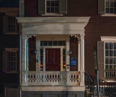 Image of the Lee-Fendall House in Alexandria, VA at night.
