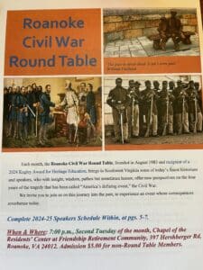 All of this effort by a great team of Round Table officers and board members has resulted in a phoenix-like rising of the Roanoke Civil War Round Table, which fully expects its growth to continue. While we have not (yet) matched the tremendous success of the 400-member Scottsdale Civil War Round Table,[6] our Civil War Round Table expects to continue its path forward, doing its part to keep alive for future generations the compelling story of “America’s Defining Event.”