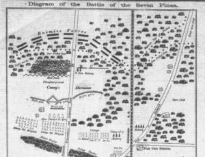 That same day, the IV Corps was south of the Chickahominy River, separated from the bulk of the Army of the Potomac with orders to fortify the intersection of the Williamsburg and Nine Mile Roads at a crossroads named Seven Pines. Casey’s division was in the vanguard, further isolated in an advance position half a mile west of the intersection, defending a fortified redoubt buttressed with six artillery pieces.[9] The division was less than six miles from Richmond.