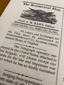 Captain Joseph M. Barr of Company K, who hailed from Wilmington, Delaware, edited The Regimental Flag. He published eight issues of the paper in the early weeks of 1862, with the last one appearing on March 13, 1862, just before the regiment shipped out to join George McClellan’s Army of the Potomac in its move up the James Peninsula.