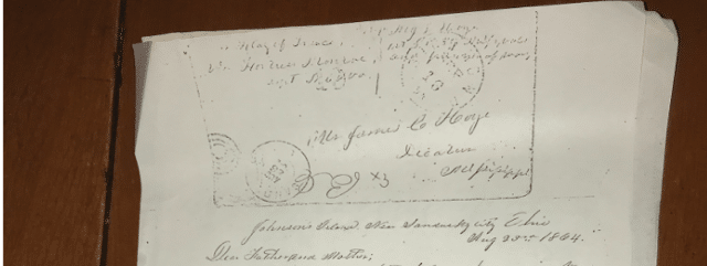 The upper right side of the envelope clearly is in Hoye’s own hand. It reads: “MJL Hoye, 1st Lt 39th Miss vols, and prisoner of war.”