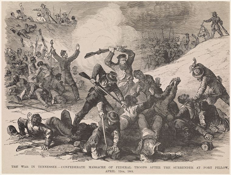 When Confederates evacuated Fort Pillow in the summer of 1862, Federals subsequently occupied it. Almost two years later, on April 12, 1864, a force of about 600 white Unionist Tennessee soldiers and Black artillery troops were defending the position when Gen. Nathan Bedford Forrest’s cavalry command attacked the fort. Early in the battle, and unbeknownst to the Confederates, they killed the fort’s commander, Maj. Lionel Booth. Unable to initially capture the fort, Forrest demanded its unconditional surrender. Assuming command, Maj. William Bradford refused the ultimatum. Forrest’s men furiously stormed the position. Some of the Union soldiers fought for a short time before breaking, many ran toward the river. Forrest’s men shot down numerous soldiers as they fled, while they shot and bayonetted many others after they attempted to surrender. Still others, trying to escape, ran into the river and drowned. In a congressional investigation held later about the action, and in which survivors provided testimony, an enormous amount of evidence showed that Forrest’s soldiers wantonly killed scores of Union soldiers, the majority being USCTs.[1]