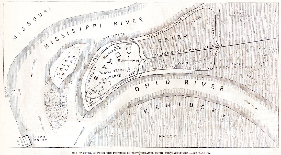 Map of Cairo, Showing the Positions of Forts Defiance, Smith, and McAllister in Frank Leslie’s Illustrated Newspaper, June 8, 1861. Dickinson College. https://hd.housedivided.dickinson.edu/node/33083