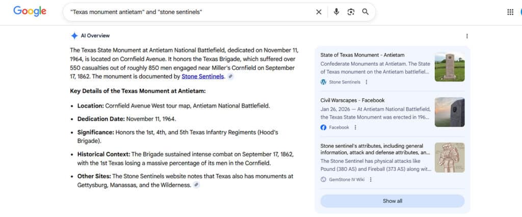 I recently researched specific Antietam monuments at https://stonesentinels.com, an excellent source for Civil War monumental research. I googled “Texas Monument Antietam” and “Stone Sentinels.” The AI Overview response appeared at the left top of the list. Just before clicking on the Stone Sentinels website on the right top, however, I noticed the oddities in the AI-supplied information: