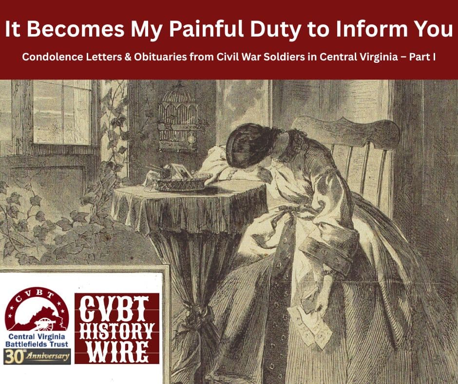April 2026 CVBT History Wire – It Becomes My Painful Duty to Inform You: Condolence Letters & Obituaries from Civil War Soldiers in Central Virginia – Part I