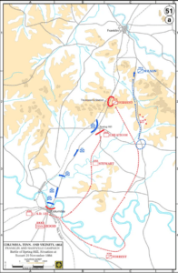 Early the next morning, Forrest began his multi-pronged movement across the Duck. Save for Buford’s battle with Federal cavalry under Col. Horace Capron at Hardison’s Mill, the Rebel advance was uncontested. By midday, fearing Forrest might make a dash for Franklin or Nashville along the Lewisburg Pike, Wilson recalled his command to Hurt’s Crossroads. By sundown, Capron’s command retired from the river crossing and likewise moved to consolidate with Wilson. Throughout the night, Forrest’s troopers maneuvered into position to outflank the Federals at Hurt’s Crossroads, and by daybreak on November 29, a sharp clash sent Wilson’s men in retreat. By 10:00 AM, Federal troopers had withdrawn to Mount Carmel, and after skirmishing there, fell back to Thompson’s Station and onto Franklin. If the day had ended there, Forrest could have taken credit for a job well done. But as the day unfolded, Forrest’s early successes were quickly overshadowed by one of his worst performances in the entire war.