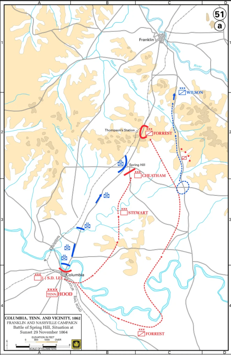 On November 27, Hood called a meeting of his corps commanders at his headquarters and outlined his plans to outflank the 28,000-man force under the command of U.S. Army Maj. Gen. John M. Schofield. Hood’s plan called for two corps of infantry under Cheatham and Stewart to cross the Duck River above (east of) Columbia and march around the Federal left flank to Spring Hill and cut off Schofield from his access to Nashville. This maneuver, however, hinged entirely on the performance of Forrest’s cavalry. For his part, Forrest’s command was to cross the Duck River and drive Maj. Gen. James H. Wilson’s Federal cavalry away from the river and toward the Lewisburg Pike.[3]