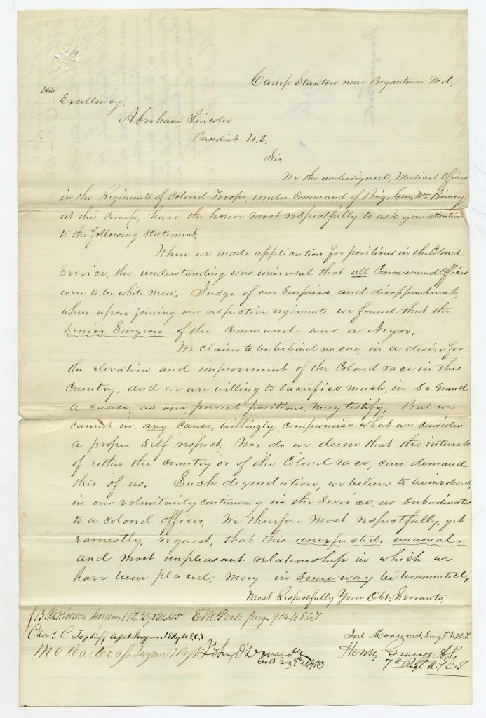In October 1863, Major Alexander T. Augusta joined his regiment at Camp Stanton in Benedict, Maryland where the mustering of the 7th, 9th, and 19th Regiments of the U.S.C.T. was taking place. Augusta’s arrival was met with controversy when the white assistant surgeons learned that Augusta, a black man, was the senior ranking medical officer among them. In protest against their situation, seven surgeons and assistant surgeons including Joel Morse, Edmund Pease, and Henry Grange, wrote a letter to President Abraham Lincoln asking that he put an end to the “unexpected, unusual and most unpleasant relationship” in which they had been placed.[1] They claimed to “be behind no one, in a desire for the elevation and improvement of the Colored race in this country…,” but they could not “in any cause, willingly compromise what we consider a proper self respect” by being subordinate to a Black men regardless of his superior rank.