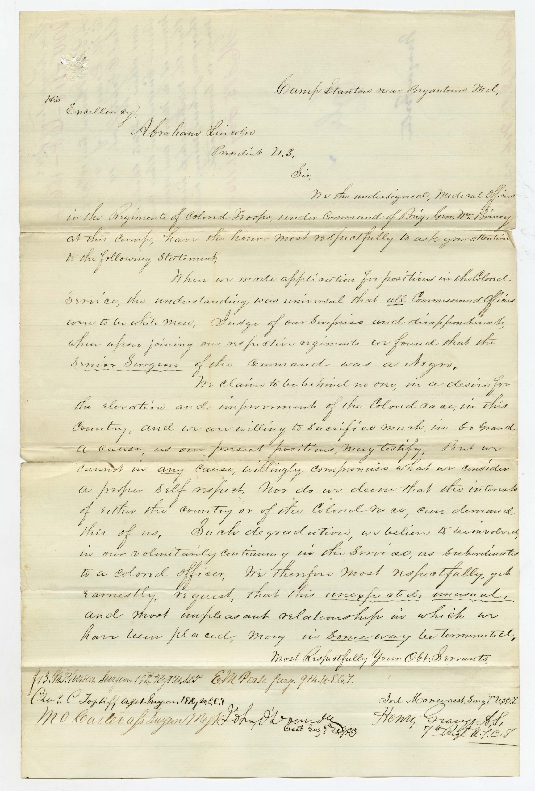 In October 1863, Major Alexander T. Augusta joined his regiment at Camp Stanton in Benedict, Maryland where the mustering of the 7th, 9th, and 19th Regiments of the U.S.C.T. was taking place. Augusta’s arrival was met with controversy when the white assistant surgeons learned that Augusta, a black man, was the senior ranking medical officer among them. In protest against their situation, seven surgeons and assistant surgeons including Joel Morse, Edmund Pease, and Henry Grange, wrote a letter to President Abraham Lincoln asking that he put an end to the “unexpected, unusual and most unpleasant relationship” in which they had been placed.[1] They claimed to “be behind no one, in a desire for the elevation and improvement of the Colored race in this country…,” but they could not “in any cause, willingly compromise what we consider a proper self respect” by being subordinate to a Black men regardless of his superior rank.