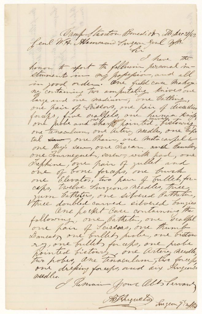 I have the honor to report the following personal instruments in my possession, and all in good order. One field case Mahogany containing two amputating knives one large and one medium, one catling, one pair of scissors, one pair of dissection forceps, five scalpels, one hernia knife, one probe and one sharp pointed curved bistonry, one tenaculum, one artery needle, one Capital, one Chain, one Metacarpel, one Hey’s saw, one Trocan and Canula, one tourniquet, screw, with pad, one Trephine, one pair of gullet and one of bone forceps, one brush, one elevator, two pair of bullet forceps, twelve surgeons needles, three gum Catheters, one silvered Catheter, and three double curved silvered bougies.