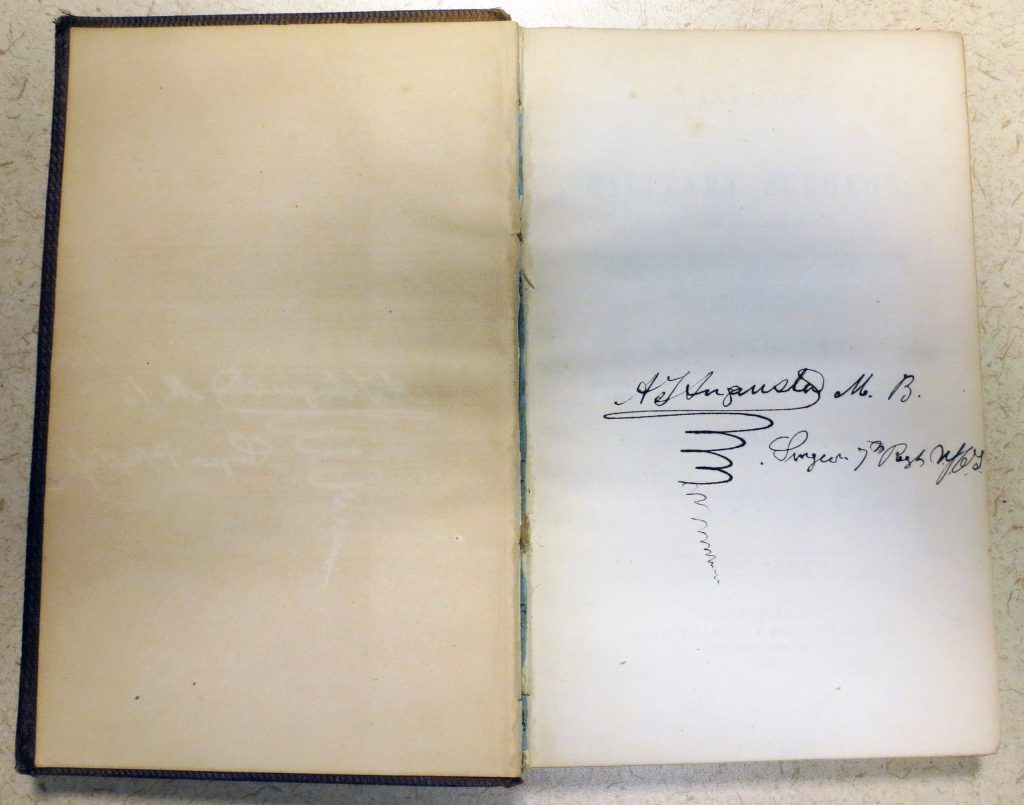 On April 4, 1863, Alexander T. Augusta received a commission with the U.S. Army as a surgeon. When he arrived in Washington, D.C., he made the rounds of several hospitals, including Armory Square Hospital where he encountered poet Walt Whitman, who served there as a nurse. Augusta was stationed at Contraband Hospital as surgeon-in-charge until he received his orders to muster in with the 7th Infantry of the United States Colored Troops at Camp Stanton in Benedict, Maryland. When Augusta arrived, he carried with him a surgical kit and his copy of the Hand-Book for the Military Surgeon which he inscribed with his name and regiment. In a letter to Surgeon General William H. Hammond, he described the surgical kit that was in his possession upon arrival.