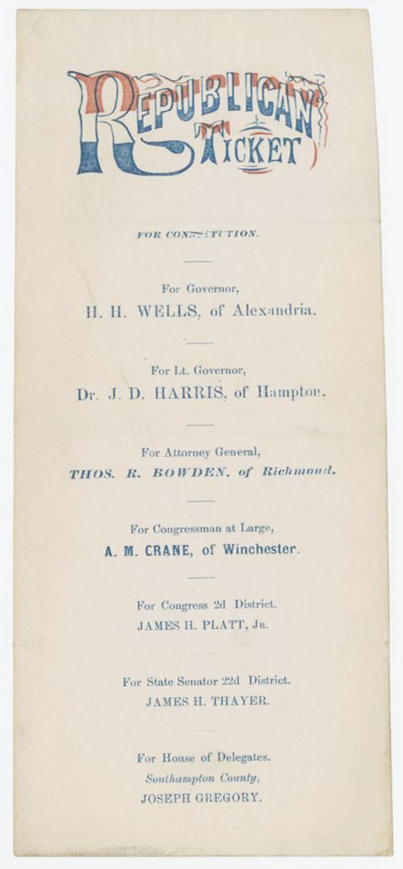 After the war in 1869, Harris pursued a political career running for Lieutenant Governor of Virginia on a Republican ticket with Henry Horatio Wells, who was acting as the provisional governor appointed by the military. When Harris was put on the ticket, it was thought by some that his “nomination will secure the entire State for the colored vote of the State for the party.[1]” Some believed “the time had come for black men,” and that every election would now have a black man on the ticket.[2] Those opposing his nomination used fear to dissuade voters from casting their vote for Harris, saying, “If the Wells ticket be elected, ‘Dr. Harris’ takes the position of Lieut. Governor, to preside over the Senate of the State. And if Wells should die, or be elected to the Senate of the U.S.—for which, it is said, he has aspirations, ‘Dr. Harris’ becomes Governor of Virginia!”[3]
