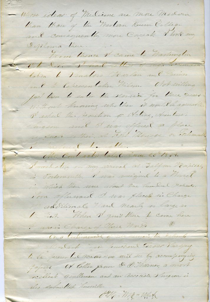 From thence I came to Washington City, D.C. I had letters of high recommendation taken to Senators Harlan and Grimes and to Representative Wilson. Not willing just then to enter the service for three years without knowing whether it would be agreeable, I asked the position of Acting Assistant Surgeon and I was offered a place as such at either Fort Monroe or Portsmouth. I preferred the latter.