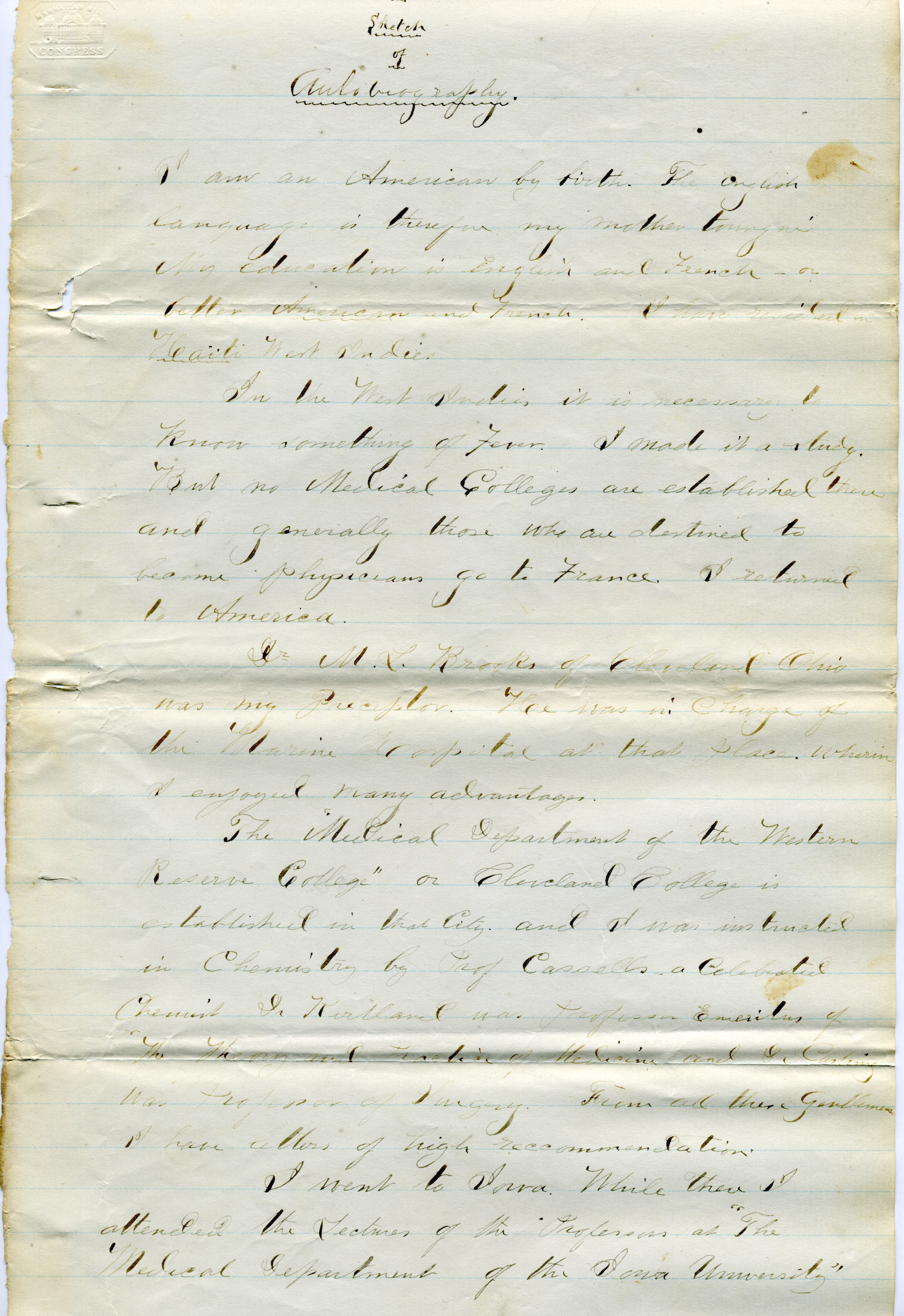 Harris’s handwritten “Sketch Autobiography,” part of his military application, describes his background, his time spent in Haiti, and his medical education and experience.