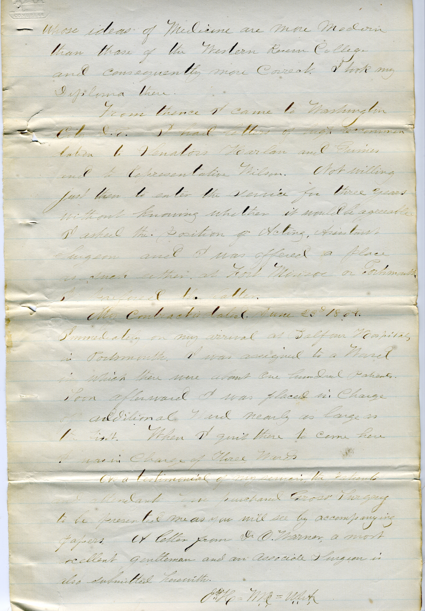 From thence I came to Washington City, D.C. I had letters of high recommendation taken to Senators Harlan and Grimes and to Representative Wilson. Not willing just then to enter the service for three years without knowing whether it would be agreeable, I asked the position of Acting Assistant Surgeon and I was offered a place as such at either Fort Monroe or Portsmouth. I preferred the latter.